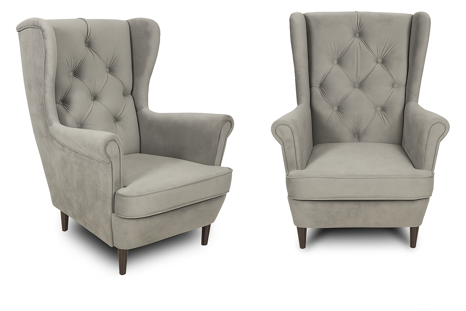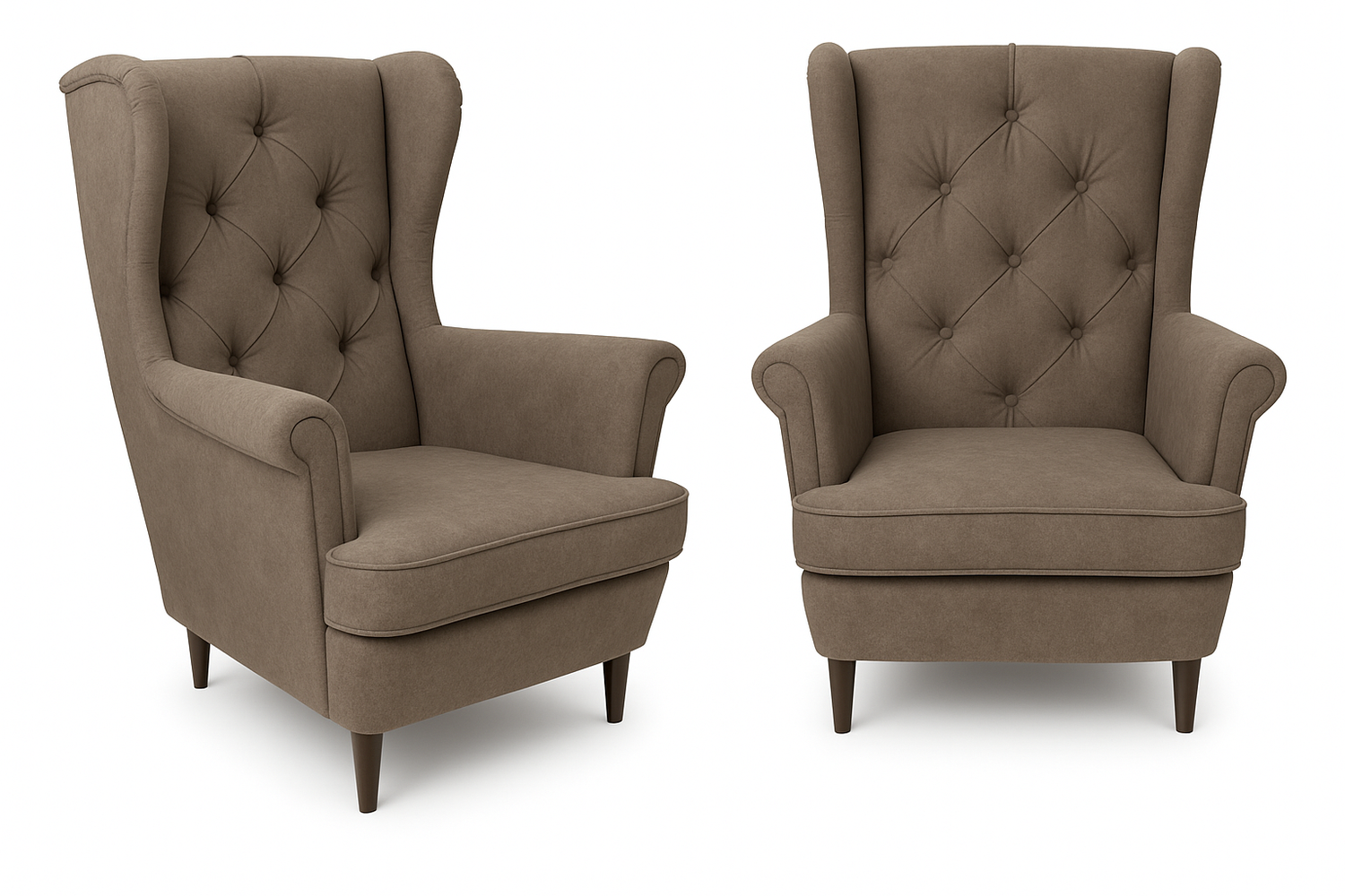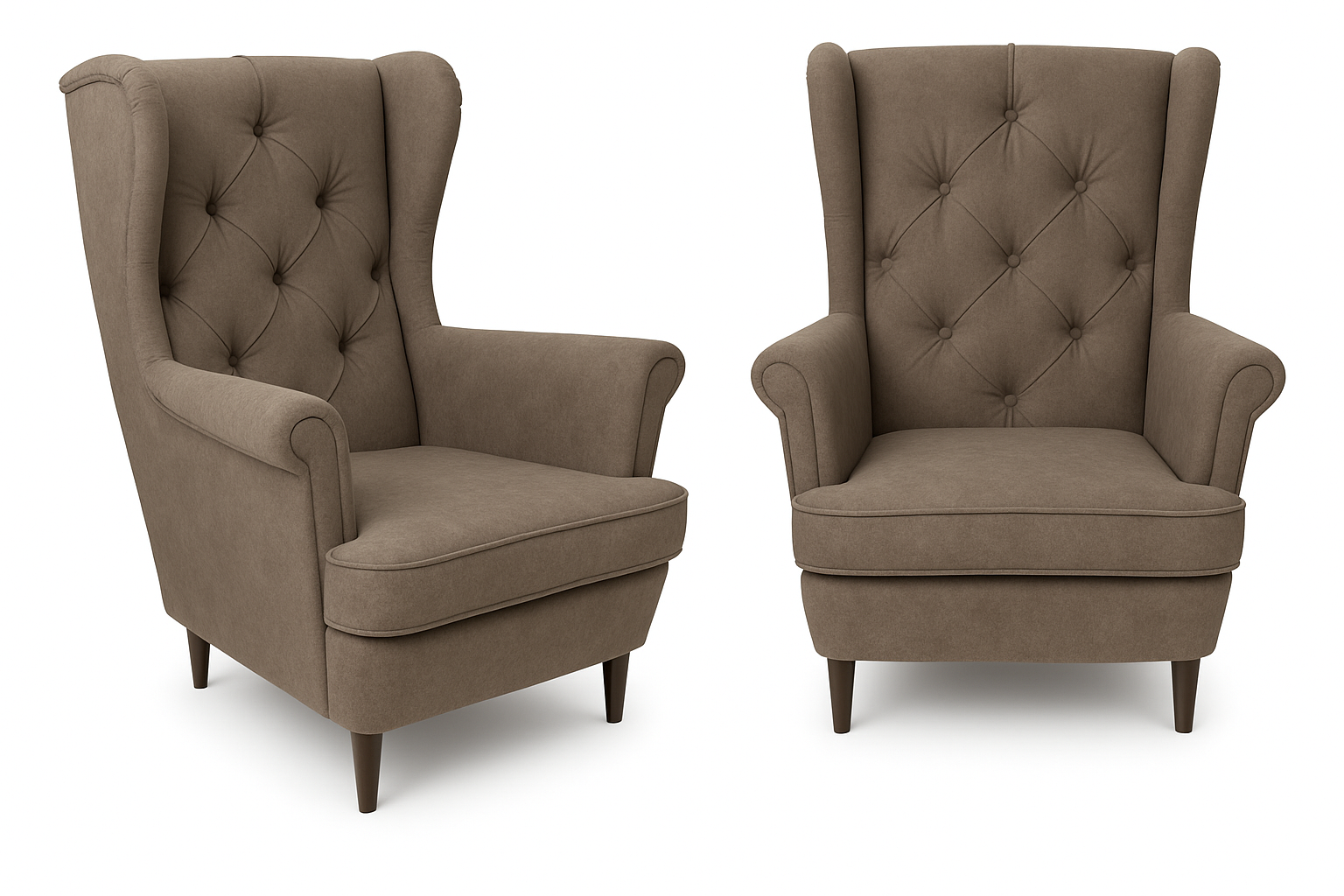 Klasyczny fotel z wysokim, pikowanym oparciem i profilowanymi bokami, odpowiedni do salonu, biura czy kącika do czytania.