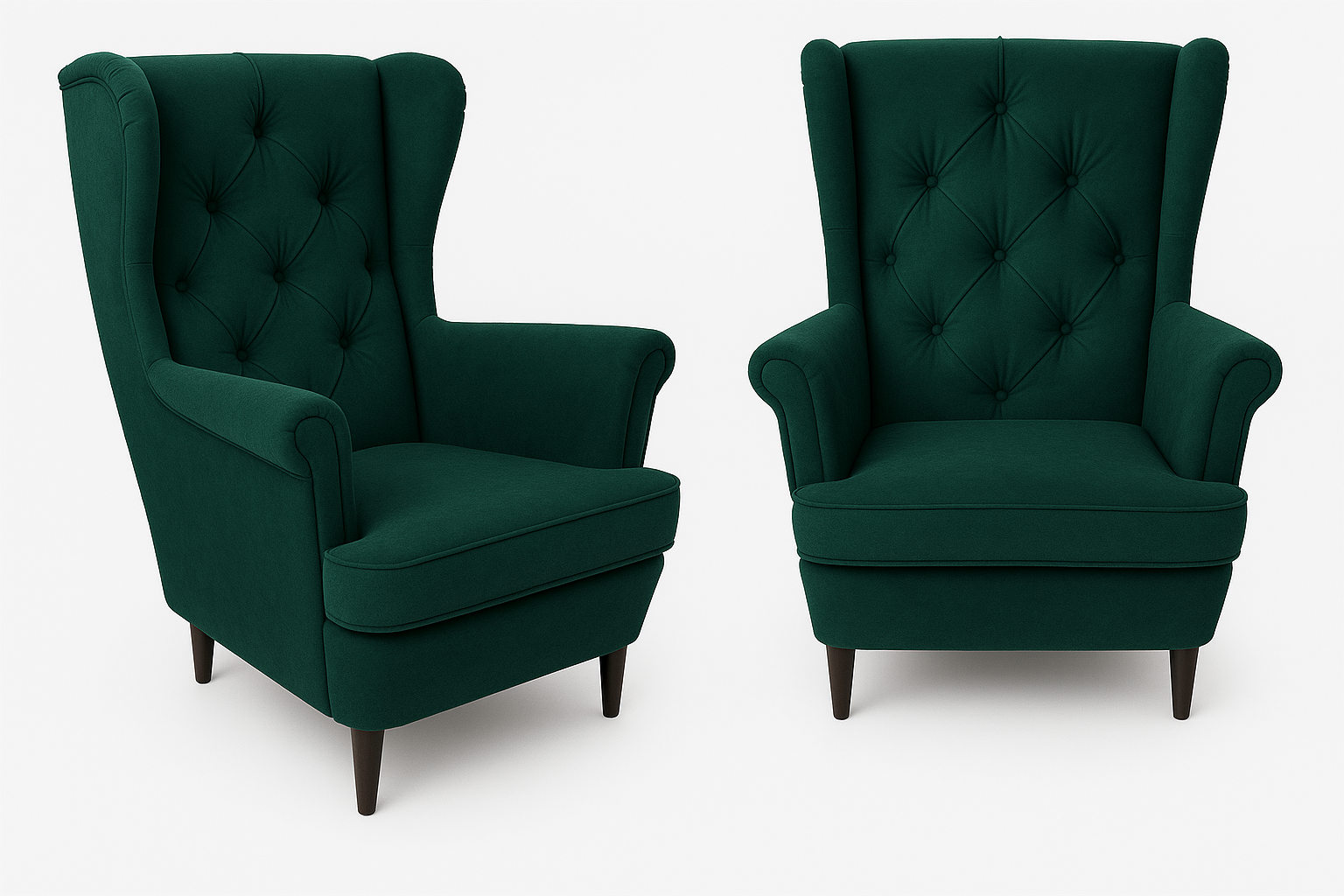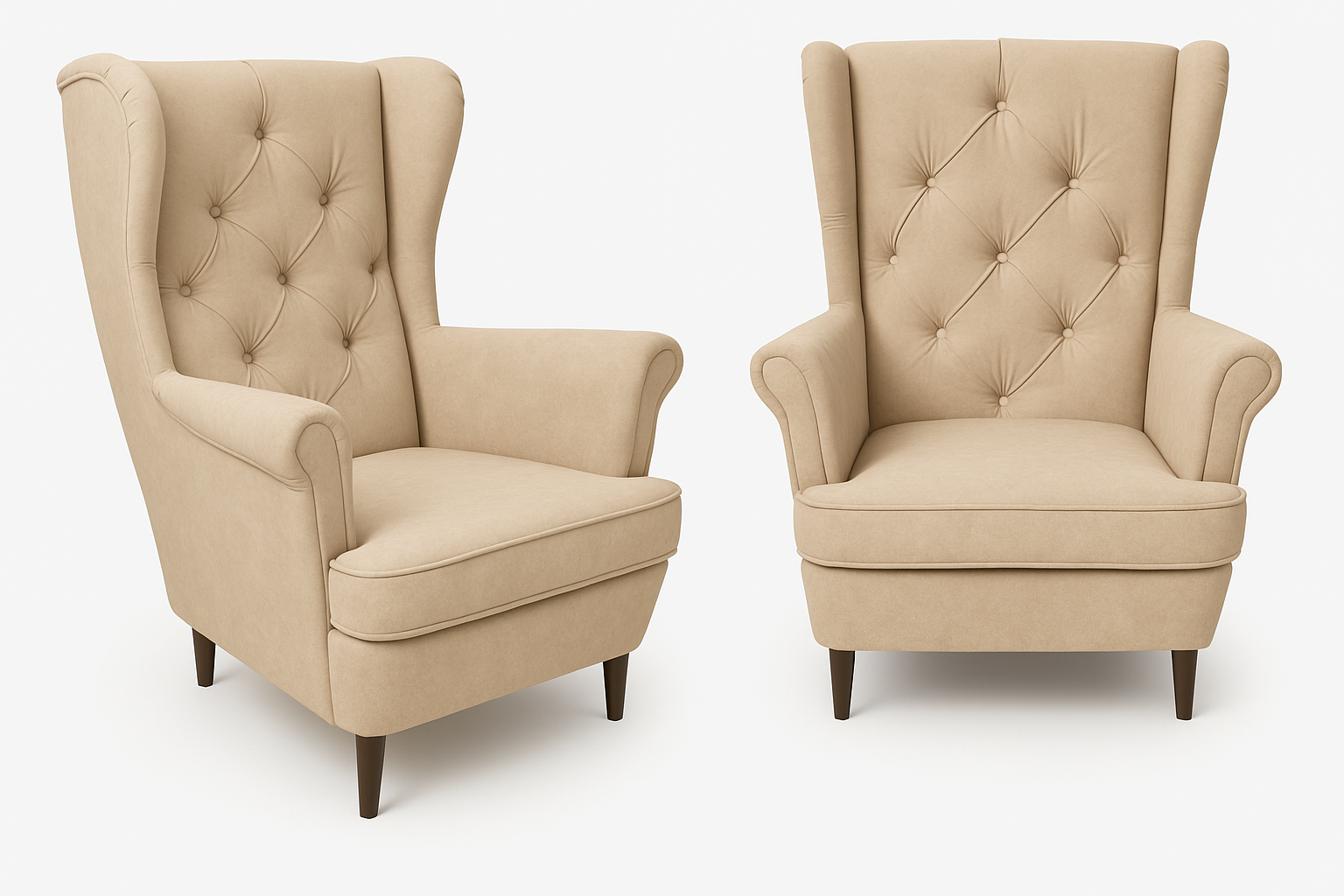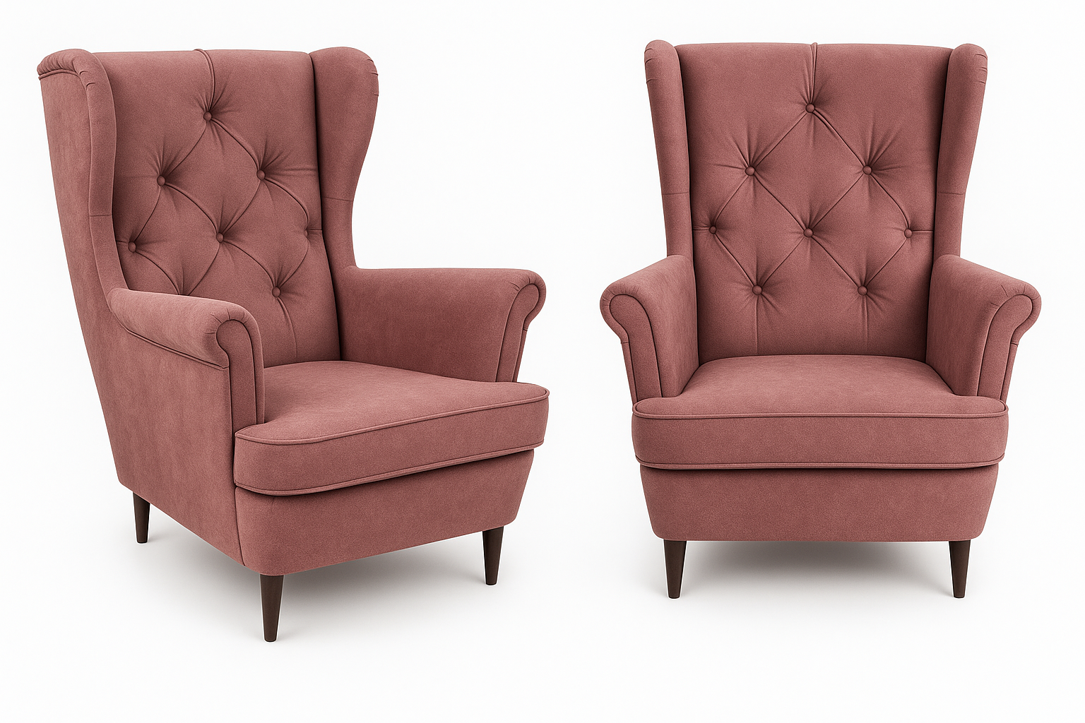 Klasyczny fotel z wysokim, pikowanym oparciem i profilowanymi bokami, odpowiedni do salonu, biura czy kącika do czytania.