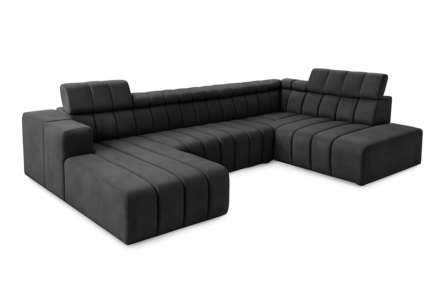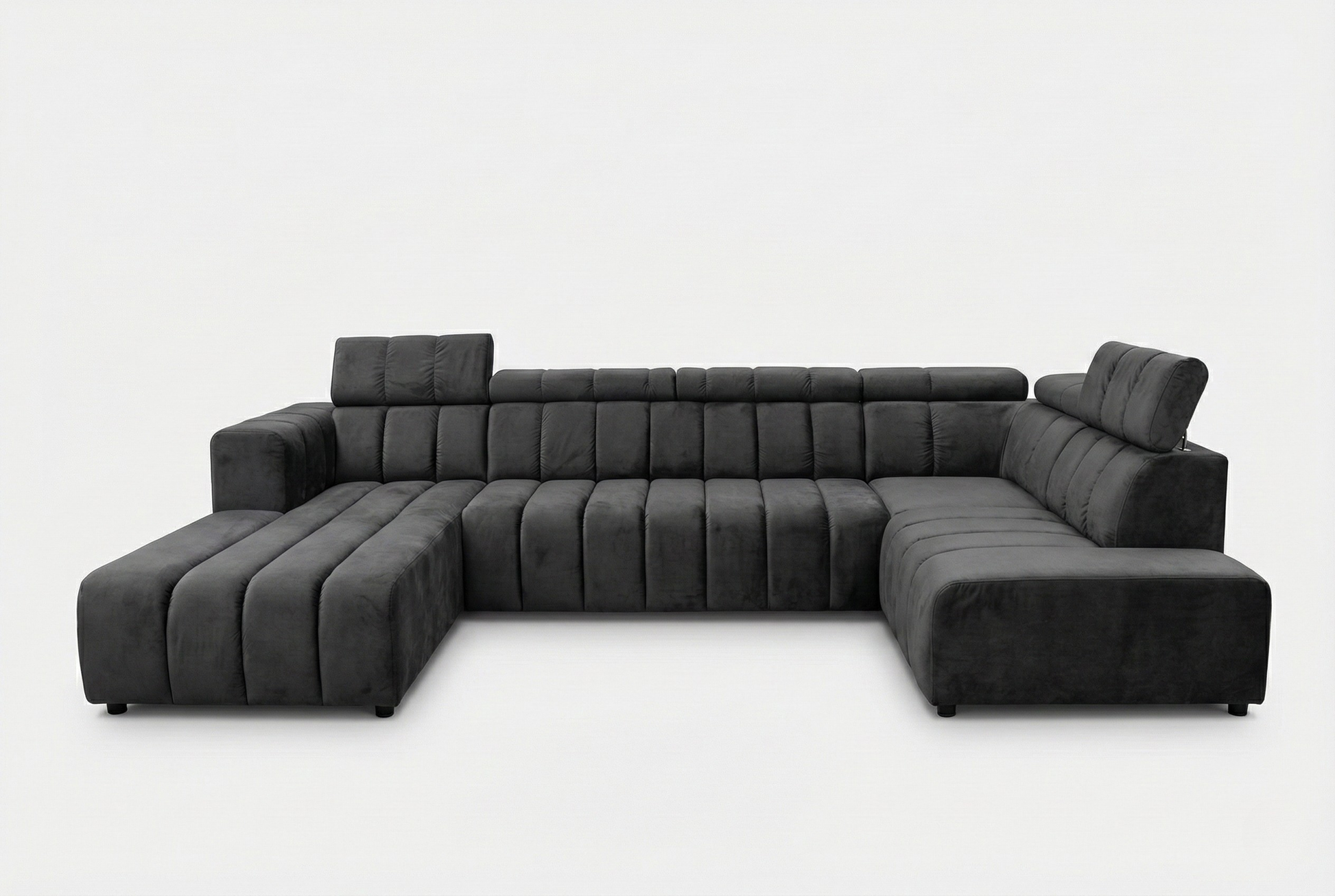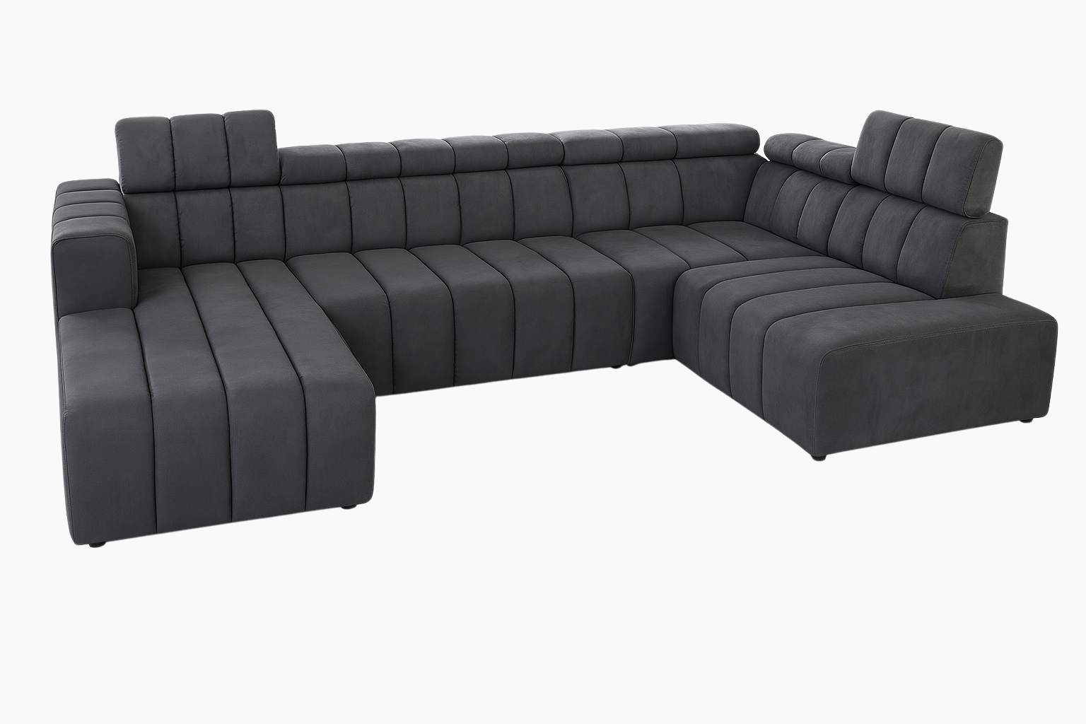 Narożnik wypoczynkowy o rozbudowanej bryle, zaprojektowany z myślą o dużych salonach i użytkownikach, którzy chcą mieć jedno, konkretne miejsce do siedzenia, leżenia i wspólnego spędzania czasu. Charakterystyczne pionowe przeszycia nadają mu wyrazisty, konsekwentny wygląd na całej długości mebla.