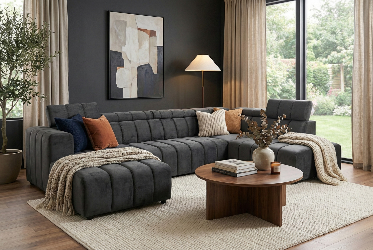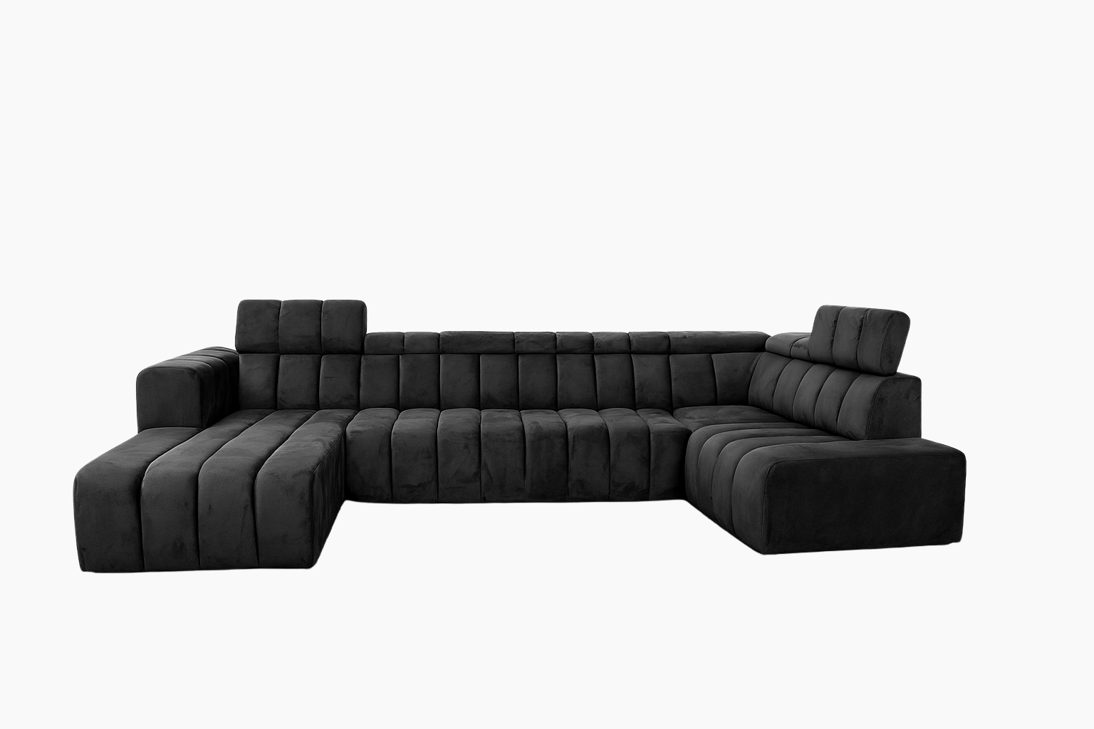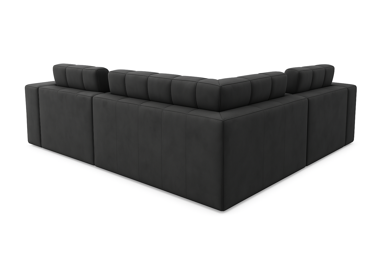Narożnik wypoczynkowy o rozbudowanej bryle, zaprojektowany z myślą o dużych salonach i użytkownikach, którzy chcą mieć jedno, konkretne miejsce do siedzenia, leżenia i wspólnego spędzania czasu. Charakterystyczne pionowe przeszycia nadają mu wyrazisty, konsekwentny wygląd na całej długości mebla.