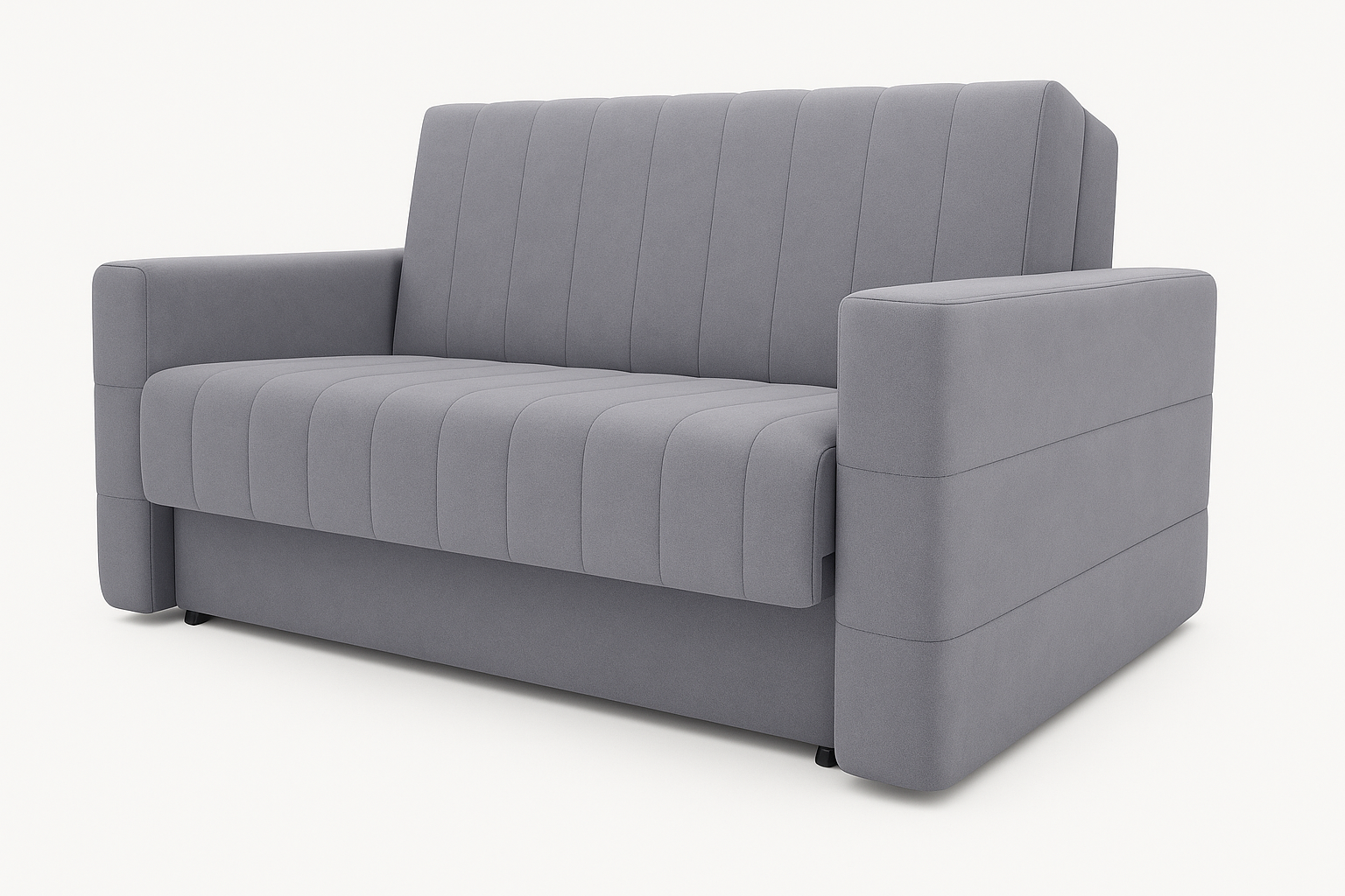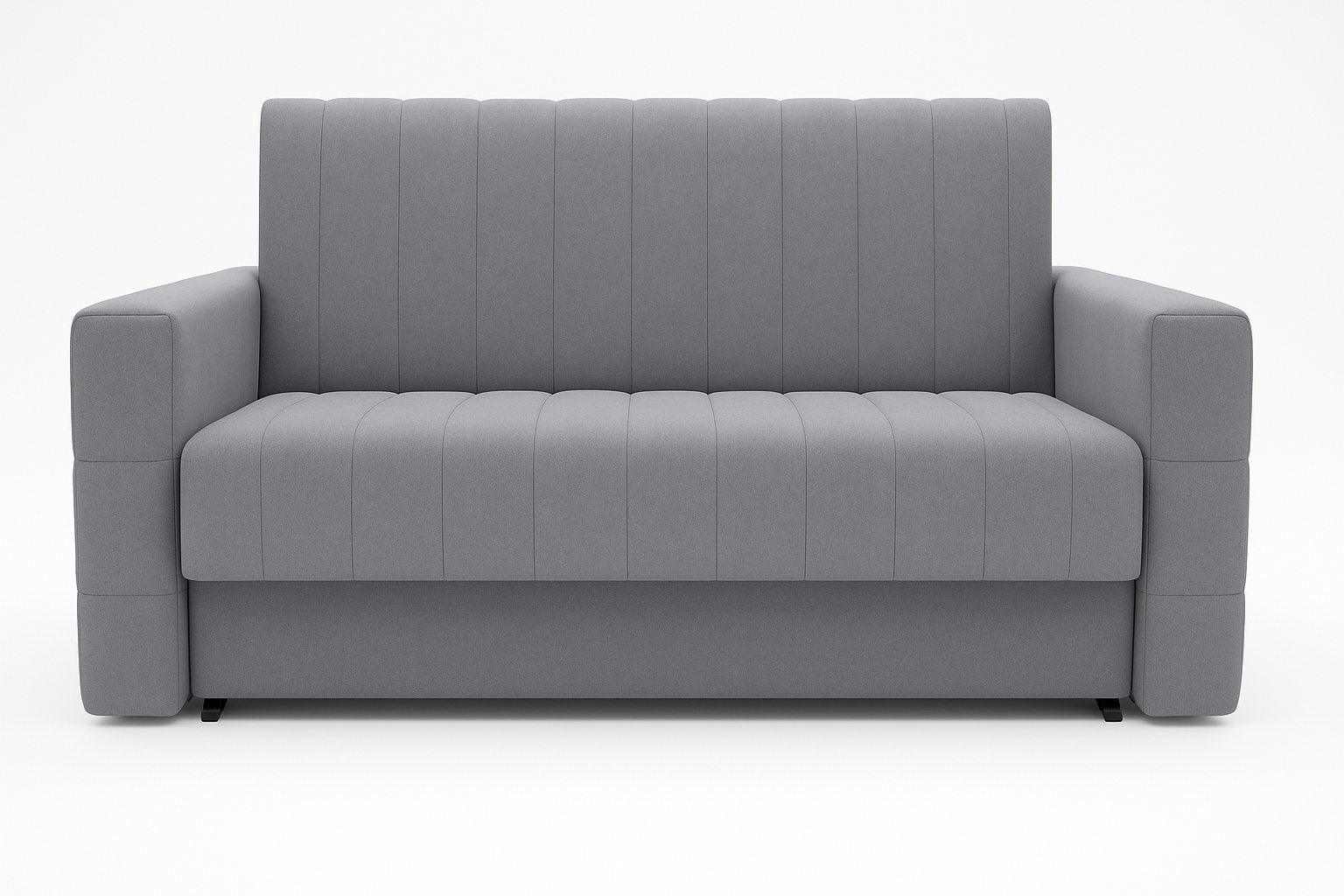 Sofa z funkcją spania o prostej, geometrycznej formie i pionowym przeszyciu oparcia – dobra baza do małych mieszkań, pokoi młodzieżowych czy kawalerek.