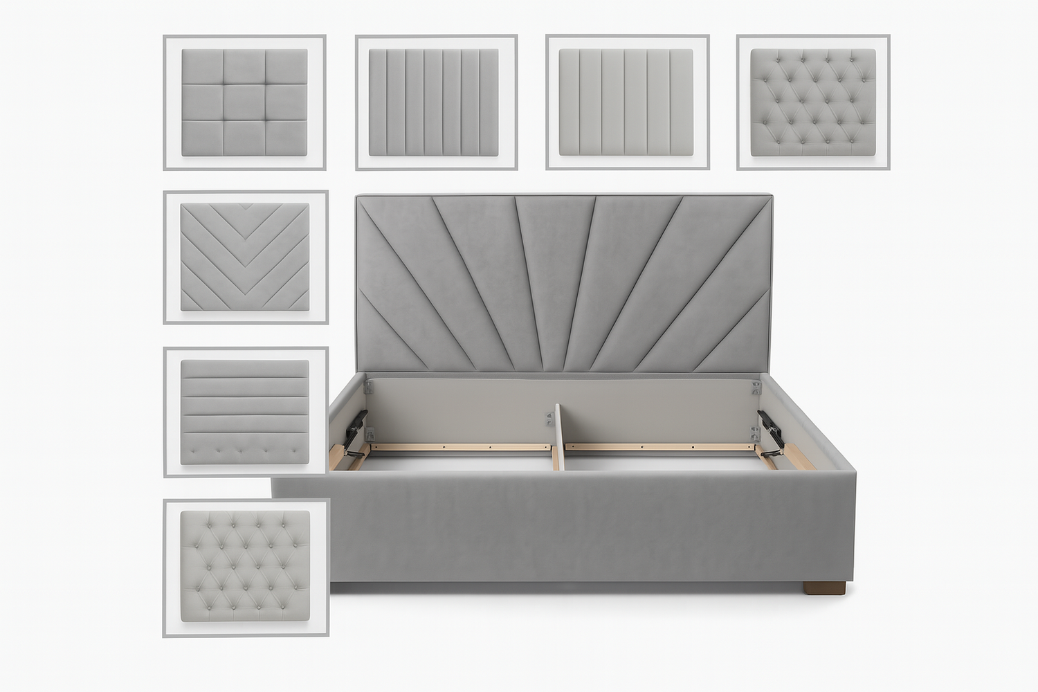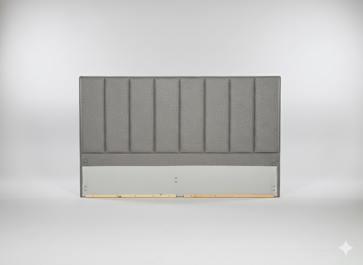 Tapicerowane łóżko z wysokim, geometrycznym zagłówkiem, które porządnie domyka aranżację sypialni i daje stabilne oparcie do czytania czy pracy w łóżku.