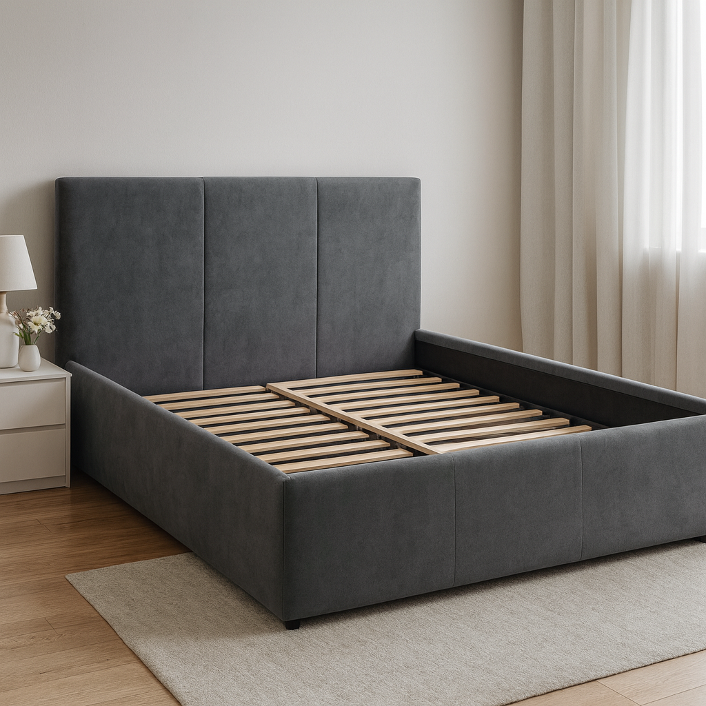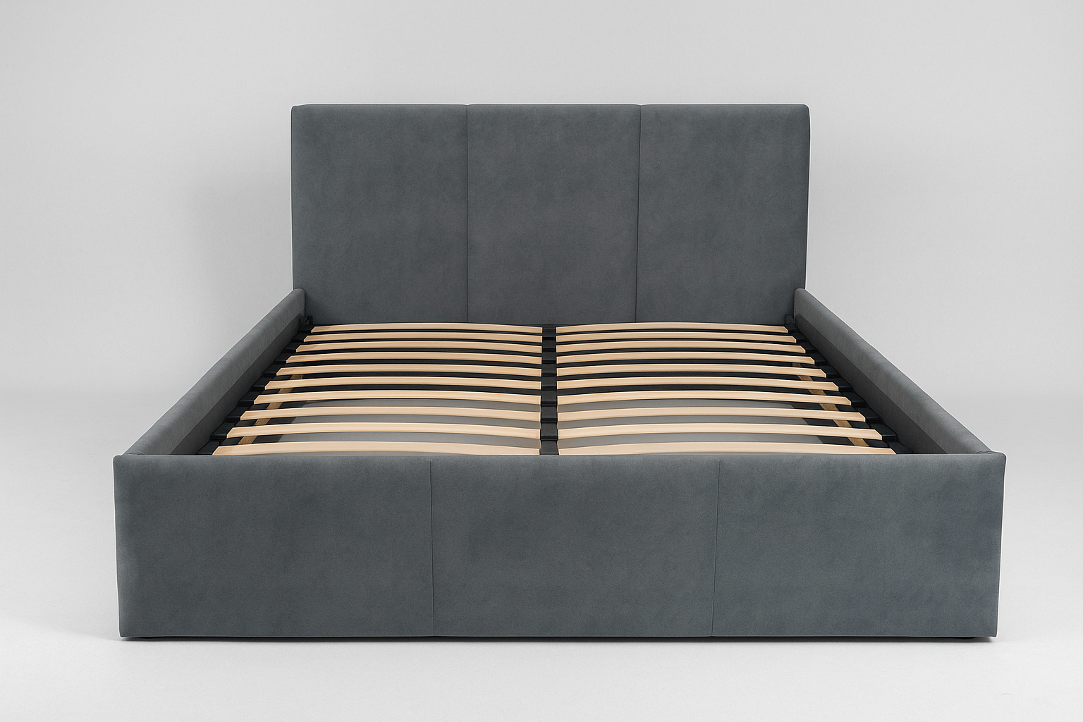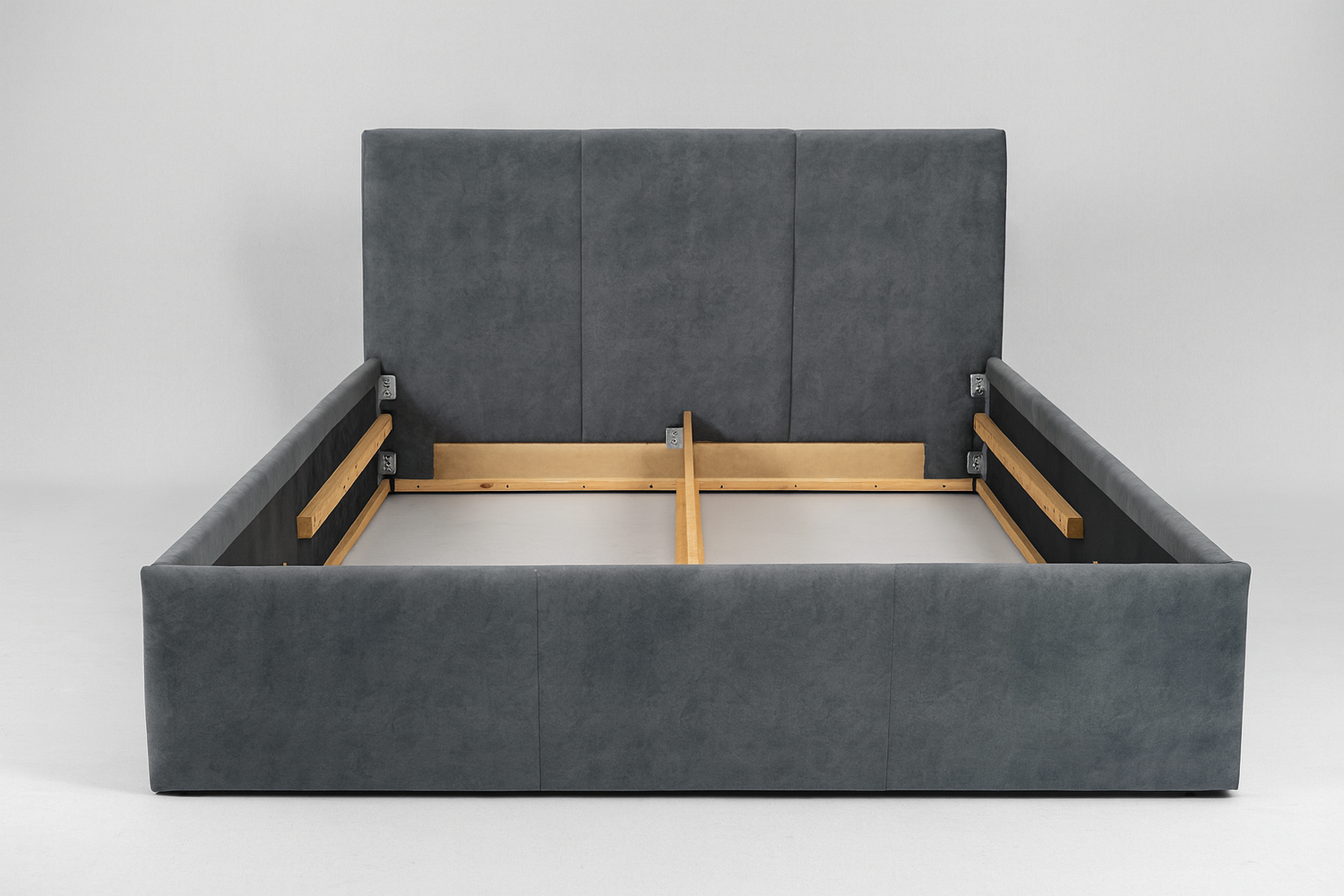 Łóżko tapicerowane z wysokim, trzyczęściowym zagłówkiem o prostej, równej linii - masywna, stabilna bryła bez ozdobników, która pasuje do nowoczesnej, ale też do klasycznej sypialni.